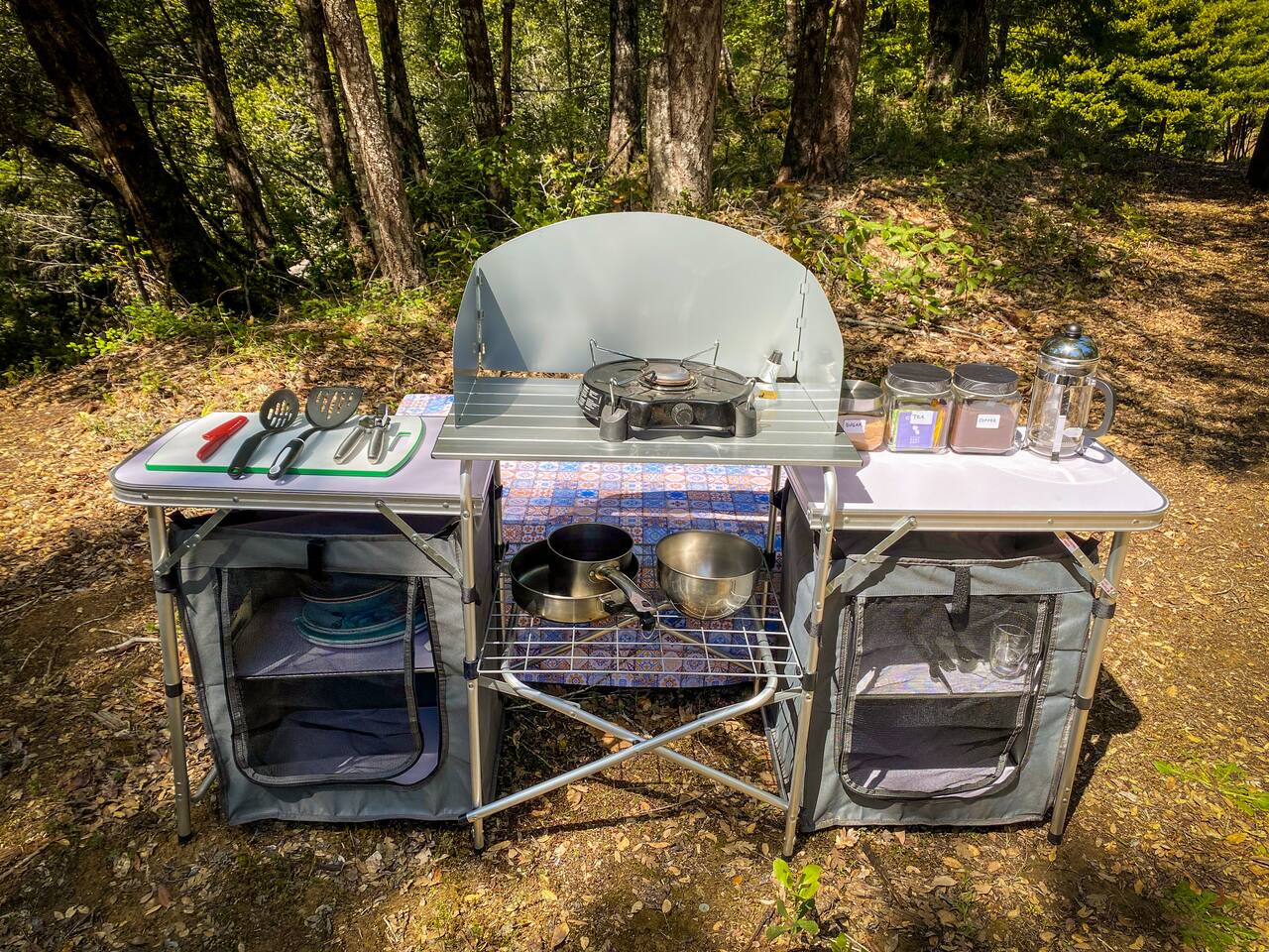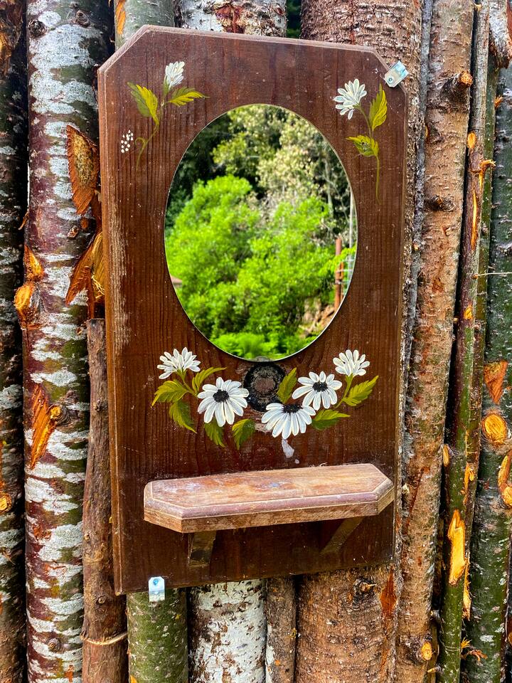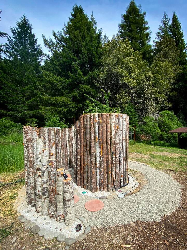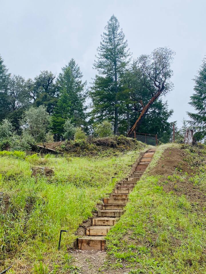 Our small family farm invites you to camp in luxury under a canopy of redwoods. Located just 10 mins outside of Garberville in a redwood valley, we offer two glamping sites that have everything you need to enjoy nature in style. One of the sites is called The Orchard. You can drive your car right up to it. The other requires climbing stairs to the top of a hill. We call that one The Knoll. This page describes The Knoll. See my other listings to view more info on The Orchard site.