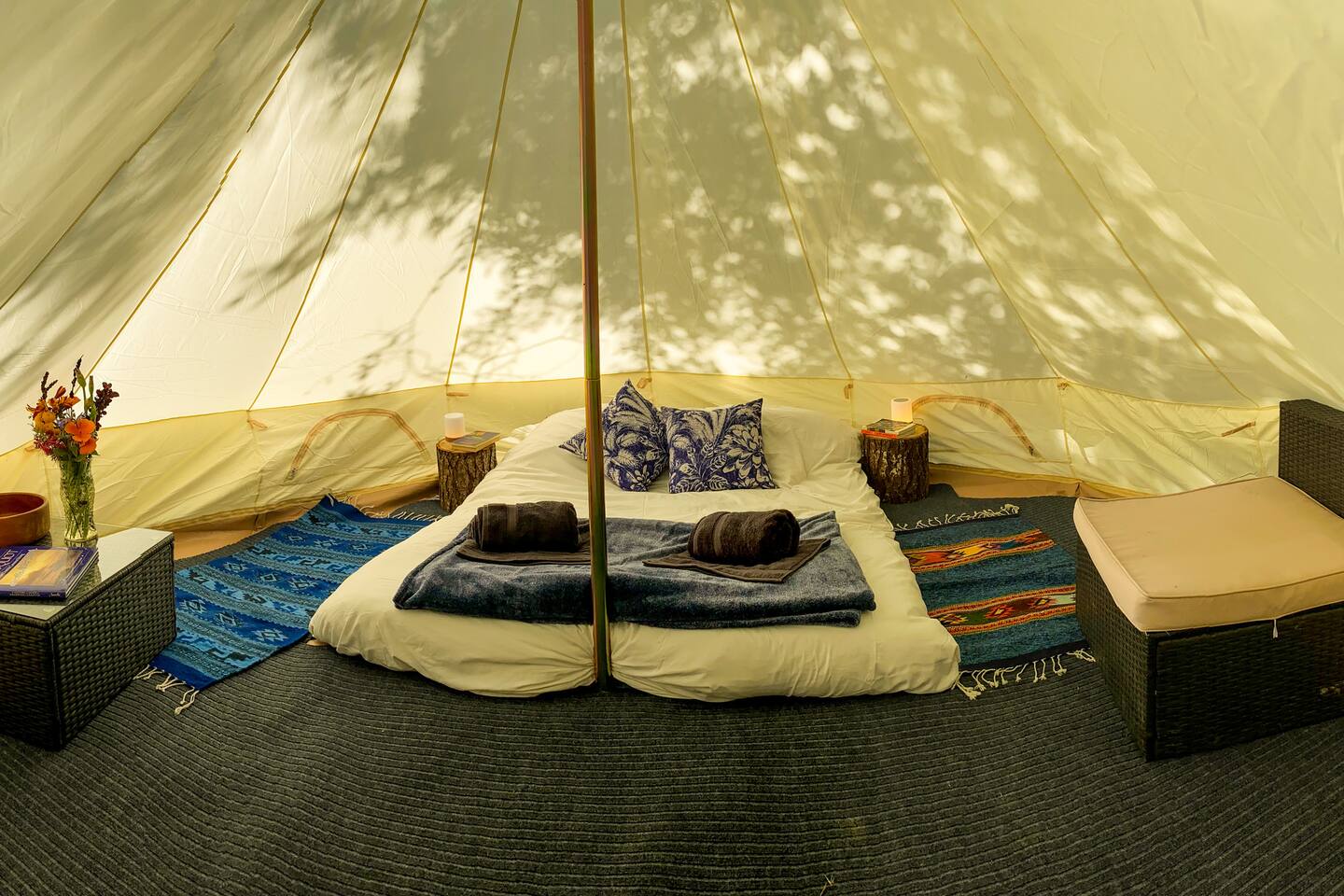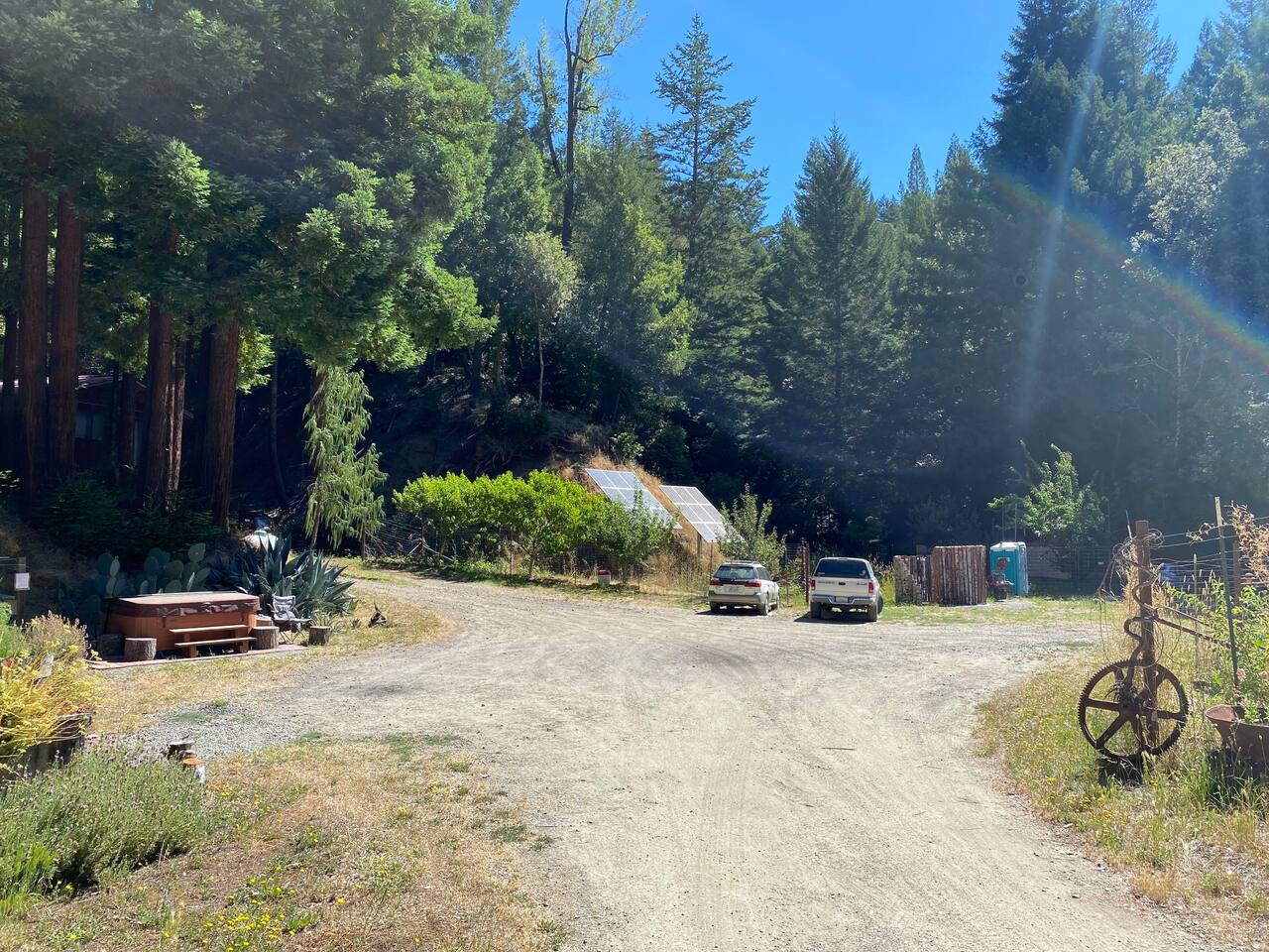 The Knoll site features a carpeted 16 foot round tent with a queen size bed with all linens, pillows blankets, as well as a couch, coffee table, and solar powered lights both inside and outside. It has a small outdoor kitchenette with a 2-burner stove, pots, pans, coffee, tea, and a 5-gallon water dispenser. Enjoy your meals on a large outdoor table. Plates, glasses and cutlery are provided. There is a cooler, a compost bin for your food scraps, porta-potty service and a hand washing station. The porta-potty is at the bottom of the hill to the Knoll about 150 feet away. For showering, we have built you a gorgeous spiral outdoor shower. Please use it before you relax under the stars in our 5 person hot tub! Please note, the hot tub is shared. Our farm is located 10 min drive outside of Garberville. Our driveway is a 2 mile dirt road in excellent condition that does require 4 wheel drive or all wheel drive vehicles. Unfortunately, this listing is not a good fit for 2 wheel drive cars. Please message us if you have any questions. We'd be happy to chat with you.